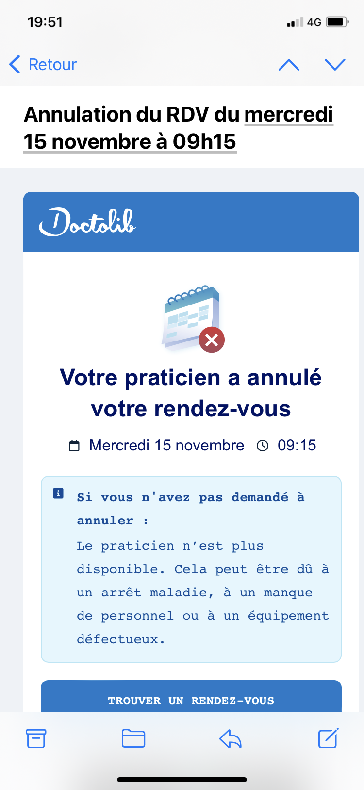 Je n'ai malheureusement pas trouvé le cabinet après avoir cherché pendant 40min. L'itinéraire indiqué sur doctolib n'est pas correct (ou pas clair en tout cas). Et impossible de les joindre par téléphone pour demander plus d'indications.